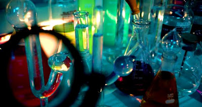 They’re also apparently interested in his capacity for learning, as they have him do little matching games and play with wooden crosses. (But like every movie scientist, they have the requisite lab full of Bunsen burners and Erlenmeyer flasks with prettily-colored liquids so we know they’re doing Important Work.)